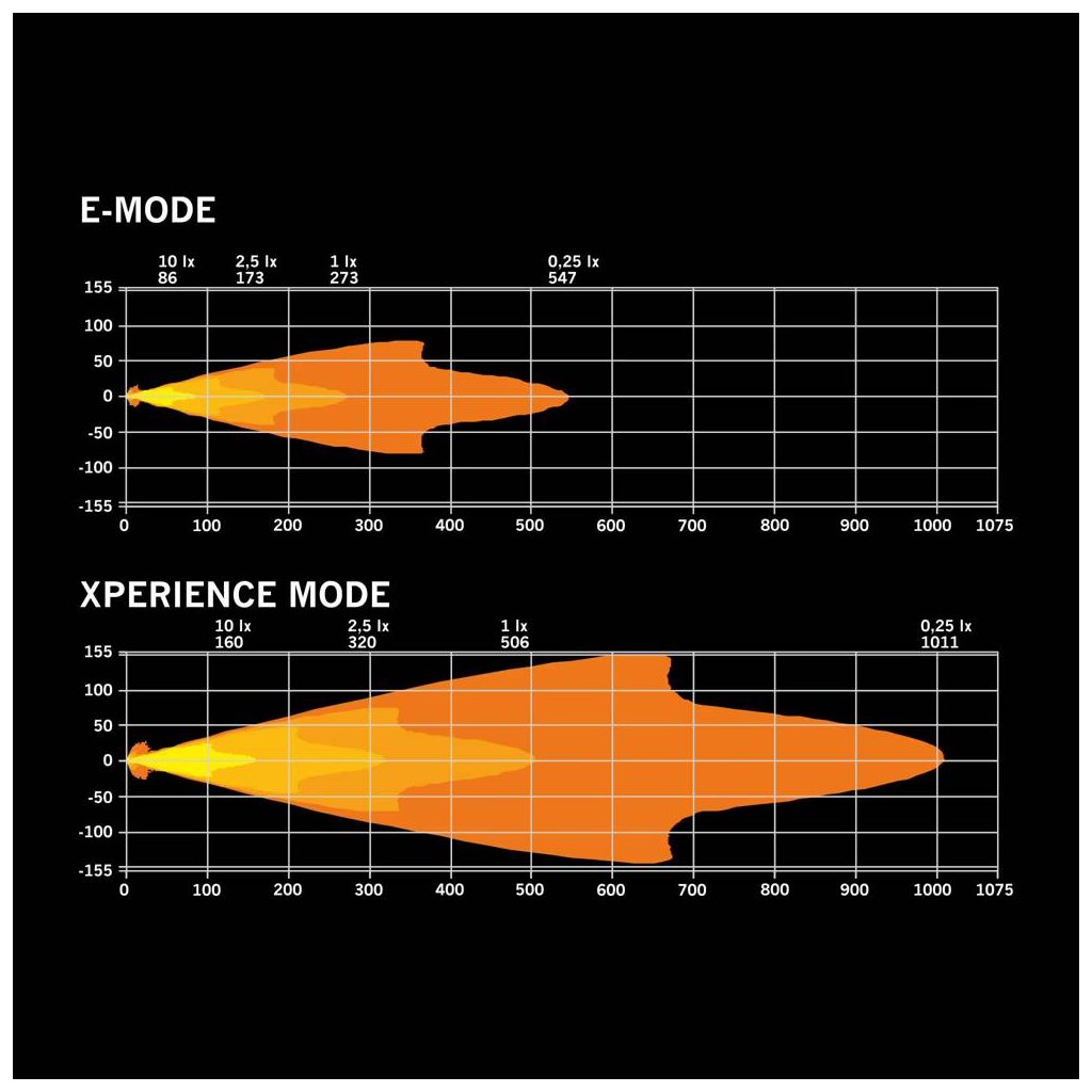 E-mode je homologován dle ECE R148/R149 s referenčním číslem 20. Xperience režim poskytuje maximální výkon 12 000 skutečných lumenů pro jízdu mimo běžně osvětlené komunikace.