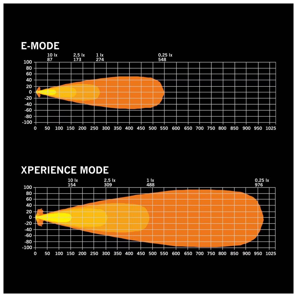 Světlo nabízí dva režimy výkonu. E-mode je homologovaný režim vhodný pro běžný silniční provoz nebo jízdu v dešti, mlze či sněhu. Xperience mode poskytuje maximální světelný výkon a je ideální pro jízdu v úplné tmě nebo mimo silnice.