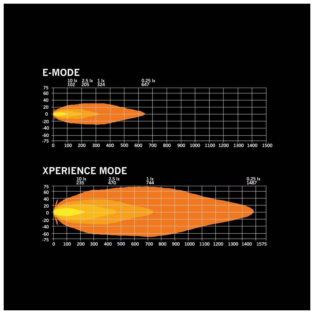 Siberia Skylord 9" kombinuje dlouhý dosvit a moderní konstrukci určenou do reálného provozu. Světelný kužel typu long-distance beam s úhlem 16,6° je navržen tak, aby poskytl výraznou dohlednost na trase a zároveň udržel využitelnou šířku světla. Díky dvěma režimům lze volit mezi E-approved režimem a režimem Xperience, který posouvá světelný výkon pro náročné situace mimo běžný silniční provoz.