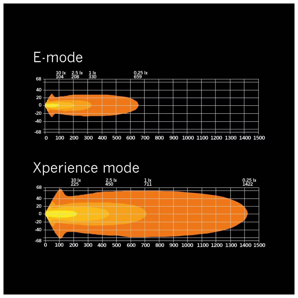 Režim E-mode nabízí nižší výkon vhodný pro běžný silniční provoz nebo jízdu v dešti, mlze či sněžení, kde příliš silné světlo může způsobovat odrazy od vodních částic.