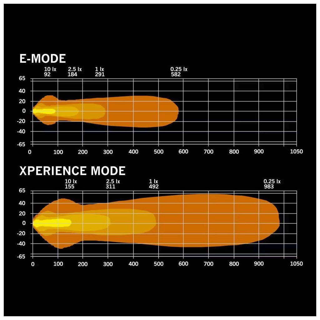 LED rampa nabízí dva režimy výkonu – homologovaný E-mode pro běžný silniční provoz a výkonný Xperience mode pro maximální světelný výkon v náročných podmínkách.