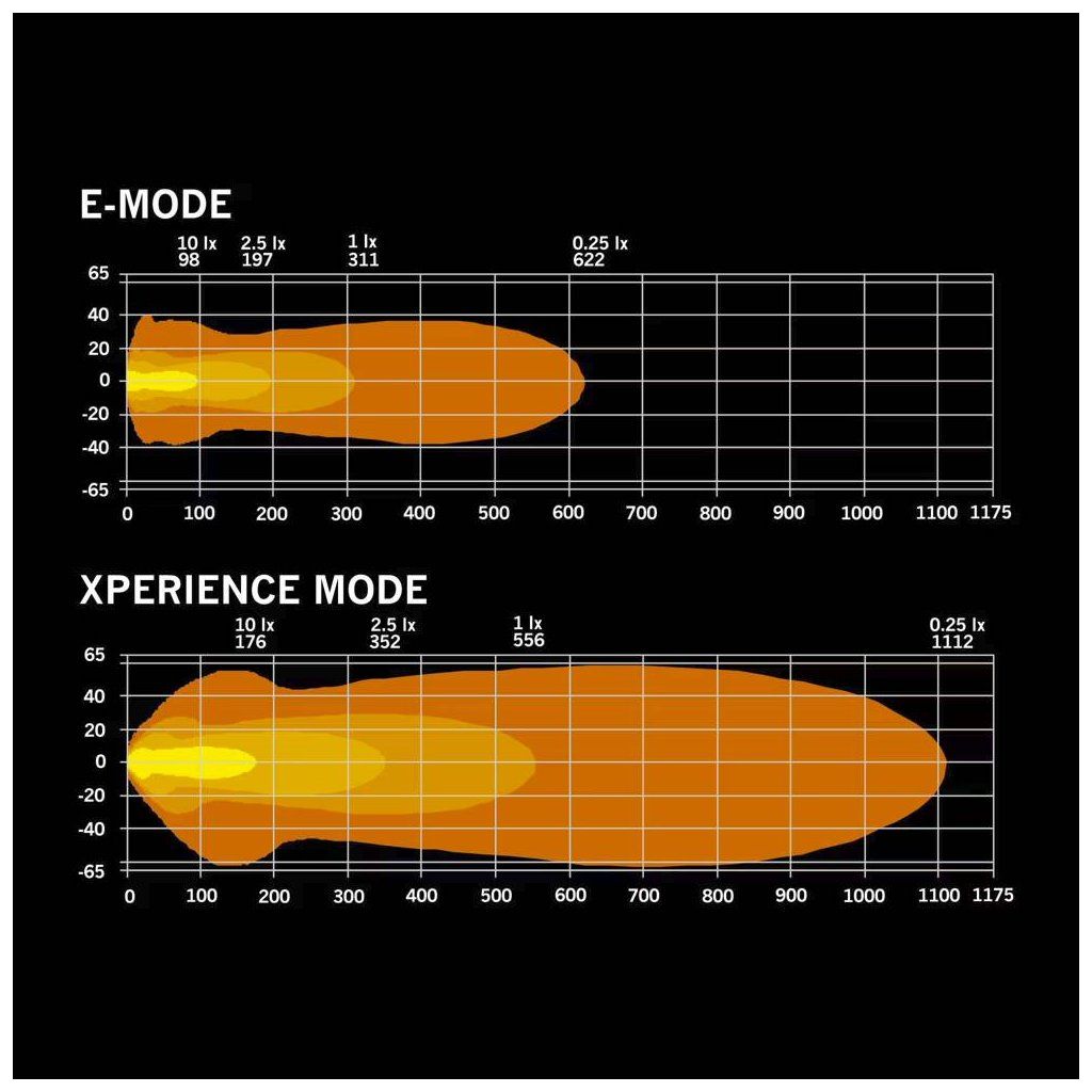 LED rampa nabízí dva režimy výkonu – homologovaný E-mode pro běžný silniční provoz a výkonný Xperience mode pro maximální osvětlení při jízdě v nejtemnějších podmínkách.