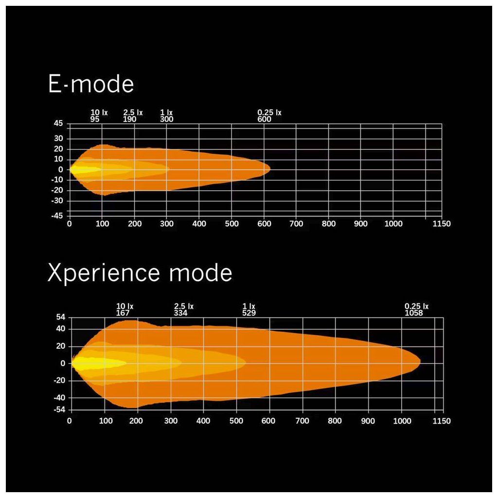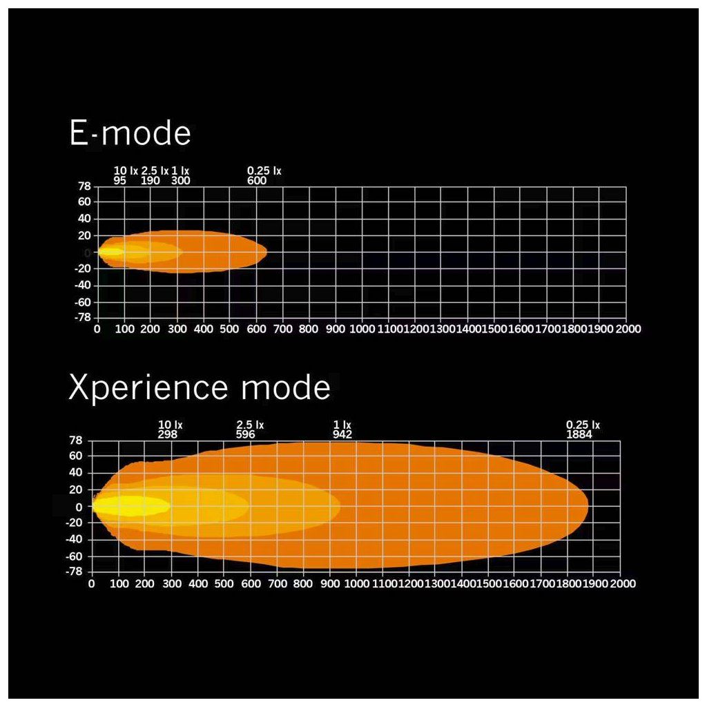 LED rampa nabízí dva režimy výkonu. Homologovaný E-mode splňuje evropské předpisy pro silniční provoz, zatímco Xperience mode poskytuje maximální světelný výkon při jízdě v náročných podmínkách.