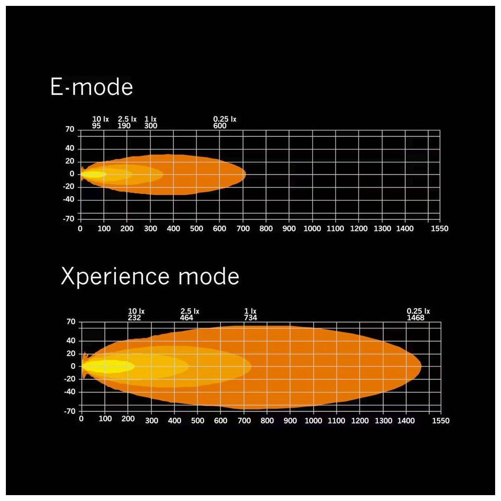 LED rampa nabízí dva režimy výkonu. E-mode poskytuje nižší výkon vhodný pro běžné používání na veřejných komunikacích, zatímco Xperience mode poskytuje maximální světelný výkon pro náročné podmínky nebo jízdu mimo silnici.