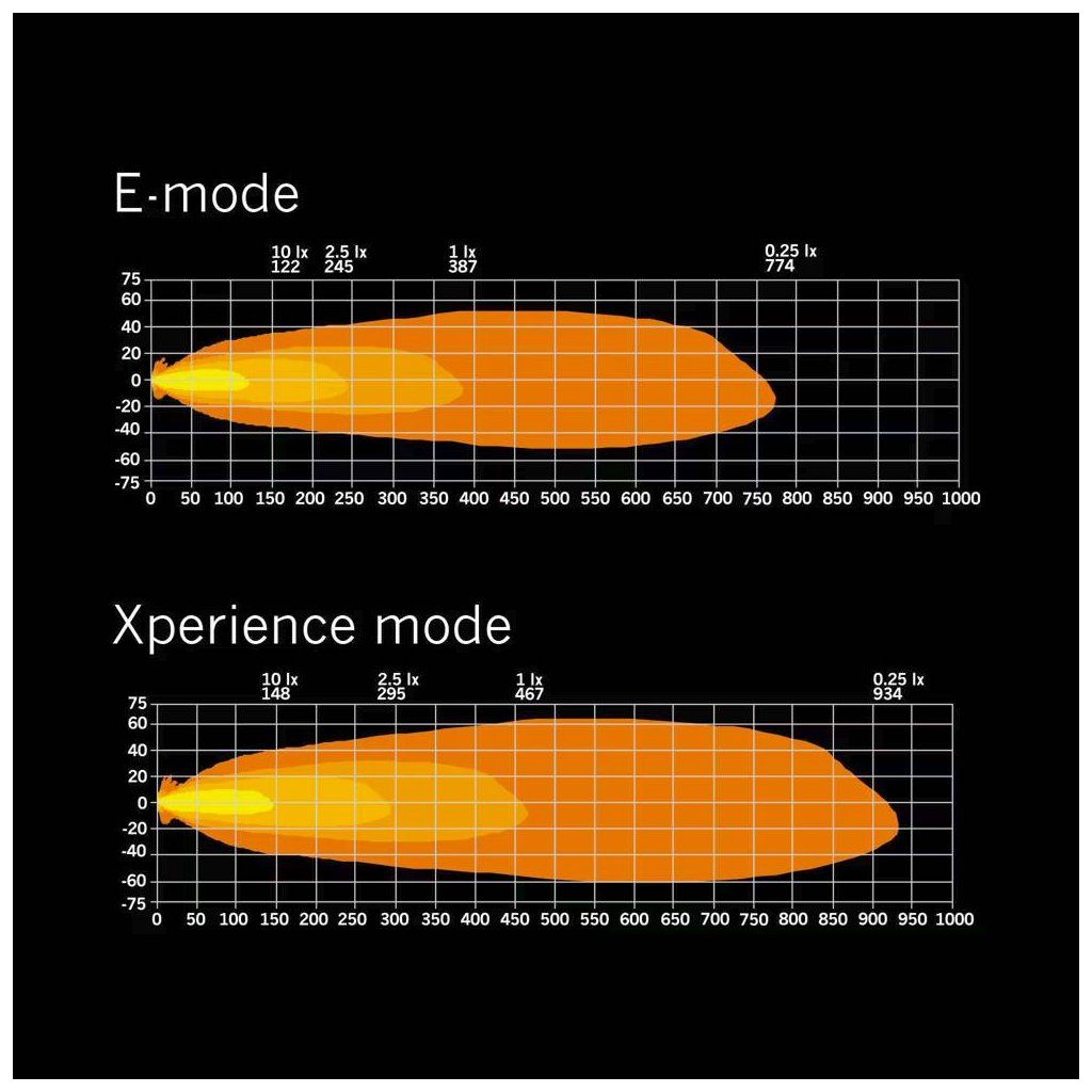 LED rampa nabízí dva režimy svícení. E-mode umožňuje provoz s nižším výkonem, zatímco Xperience mode poskytuje maximální světelný výkon pro jízdu v náročných podmínkách mimo běžný silniční provoz.
