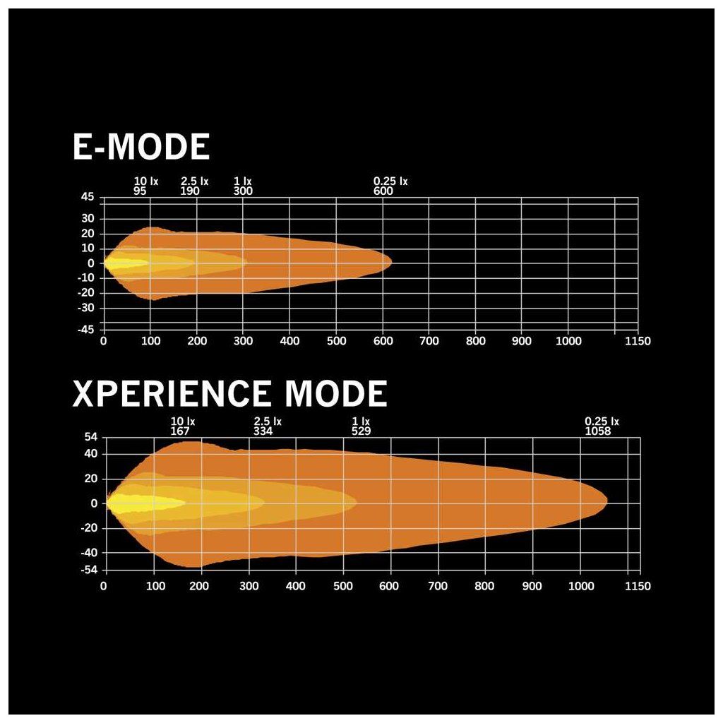 LED rampa nabízí dva režimy svícení. Xperience mode poskytuje maximální světelný výkon pro off-road a náročné podmínky. E-mode je homologovaný pro běžný silniční provoz a ideální při jízdě v dešti, mlze nebo sněhu, kdy pomáhá omezit odrazy světla.